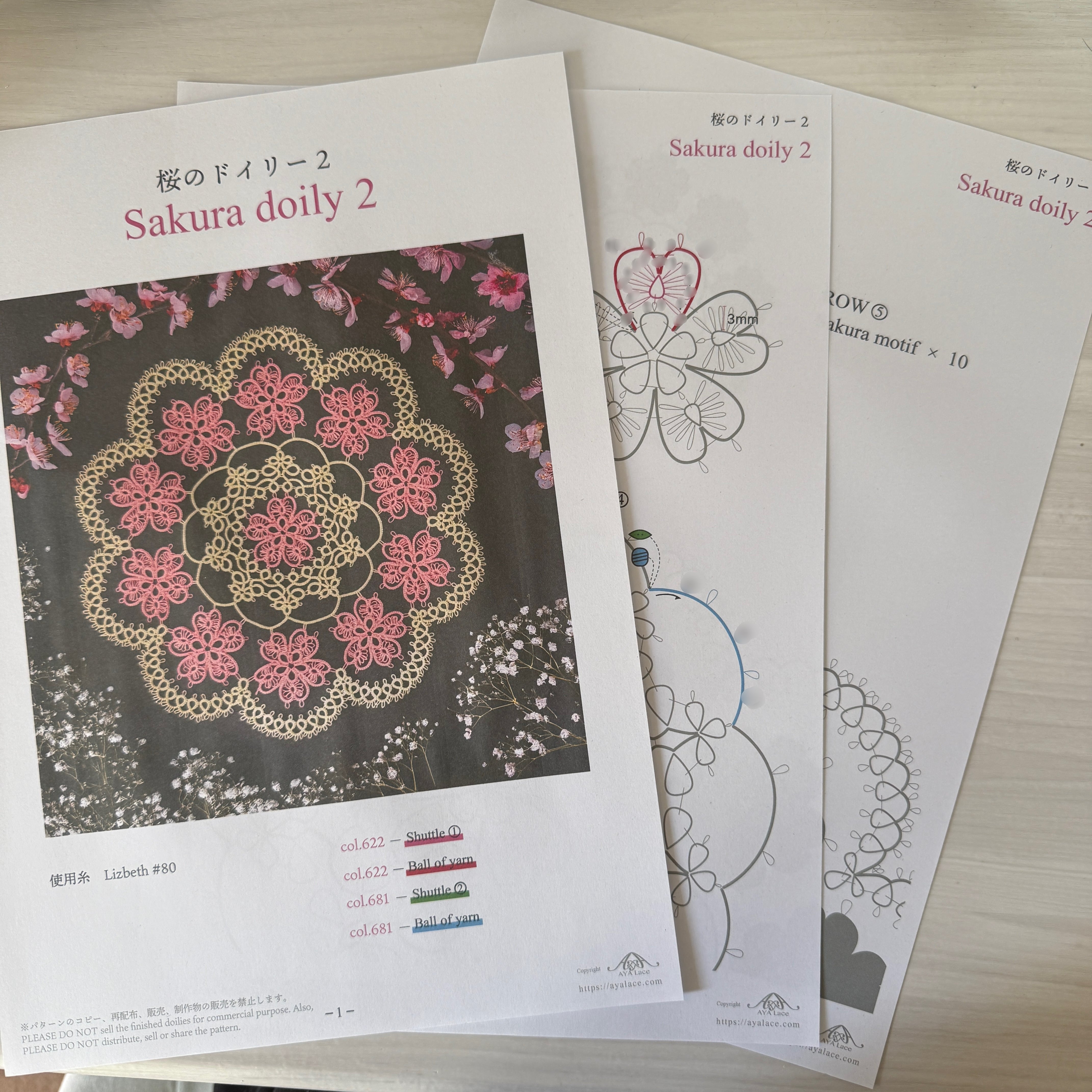 著作権について:当パターンの著作権はAYA Laceに帰属します。作成されたレースは制作者ご本人様が楽しむ目的や、ご友人・ご家族の方へのプレゼント、またはチャリティー目的の販売にのみご使用いただけます。営利目的のレース制作に当パターンを利用することは、店舗/個人を含めご遠慮ください。